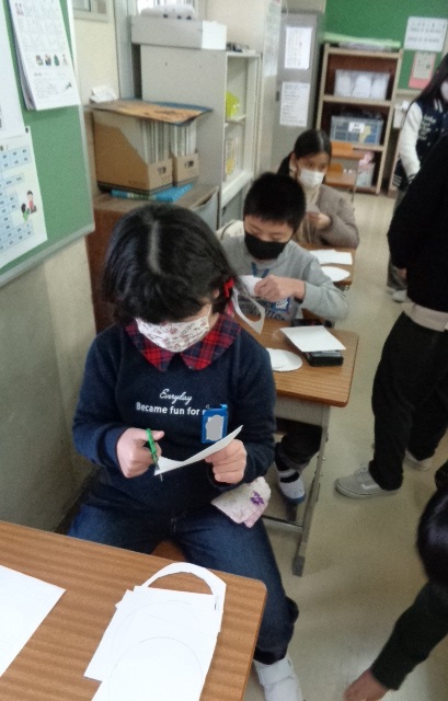コンパスで印をつけた画用紙を,ハサミで丸く切り抜きました。