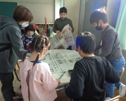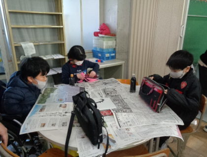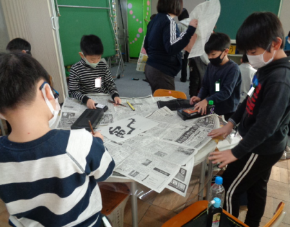 まずは新聞を敷いて準備です。3年生以上は習字の学習経験を活かして、テキパキ動いていました。1、2年生は、お兄さんお姉さんに教えてもらいながらお手伝いを頑張りました。「初めてする!」と、どきどき、わくわくしていました。