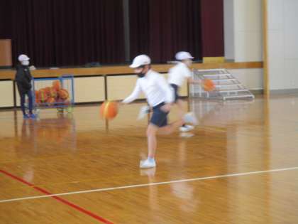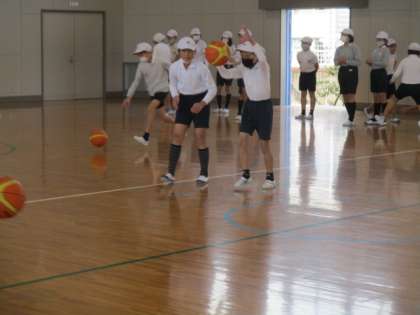 バスケットボールの学習が始まりました。ドリブルの練習をしました。