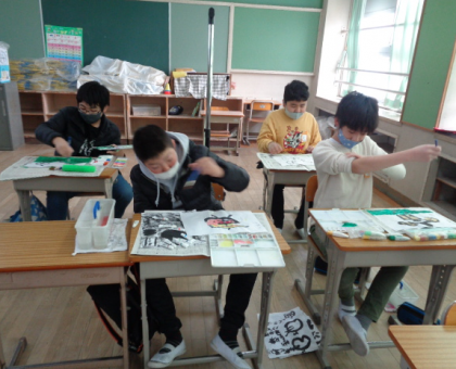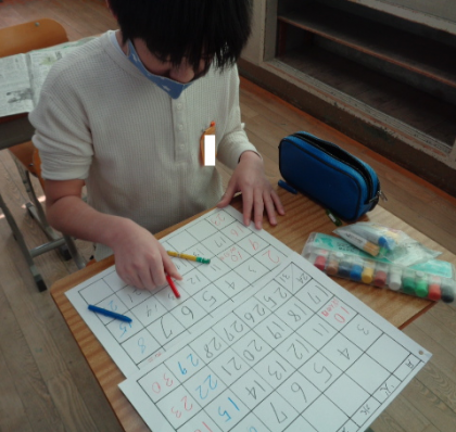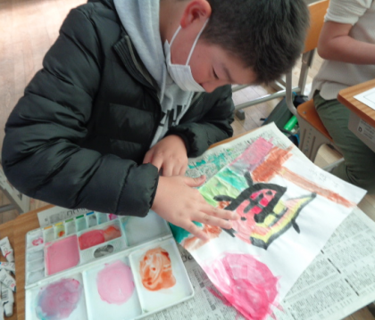 半紙が破れないように指で塗ったり、背景にもこだわったりしていました。カレンダーの完成が楽しみです。
