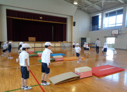 とびばこに飛び乗る、飛び降りる技を練習しました。