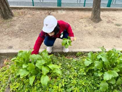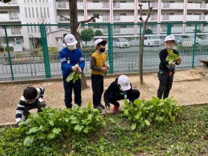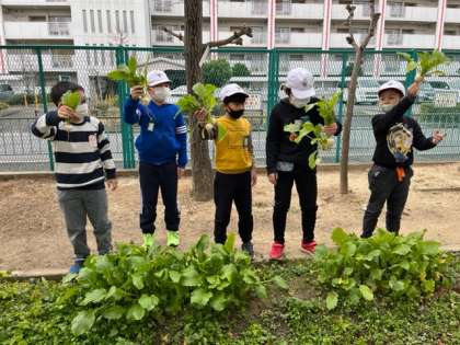 休み時間,なかよし学級の学習園へ行って,冬野菜(小カブ)の収穫をしました!