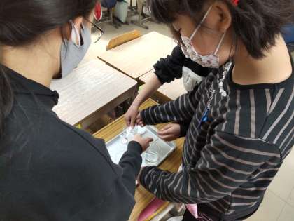 「もののとけかた」の学習で,水の量が変わると,塩が溶ける量も変わるのかという実験をしました。すりきりを使い,正確な量を入れて溶かしていました。