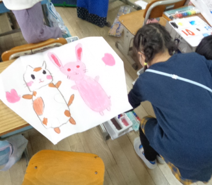 凧に大きく絵を描き、絵の具で色塗りしました。凧揚げが楽しみだね。