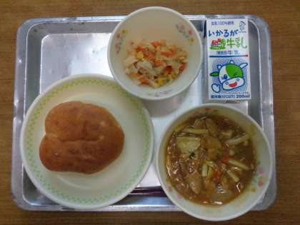 1月19日の給食は「おさつパン、牛乳、カレーうどん、大根サラダ、塩麹ドレッシング」でした。