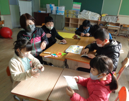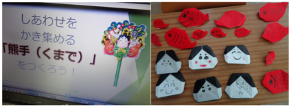 縁起物、幸せをかきあつめる熊手について知り、パーツを折り紙で作りました。福の神(おかめ)と鯛が上手にできました。少しずつ分けて製作していきます。6年生は率先して折り方を1年生に教えたり、片付けを手伝ったりしてくれました!