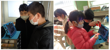 感染症対策の為、少人数グループでの活動になりましたが、タブレットのteamsというアプリを通じて他グループとビデオ通話ができるので、「おーい!」「これ見て!」等、嬉しそうに呼びかけていました。