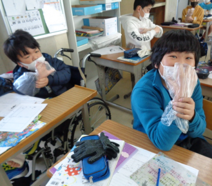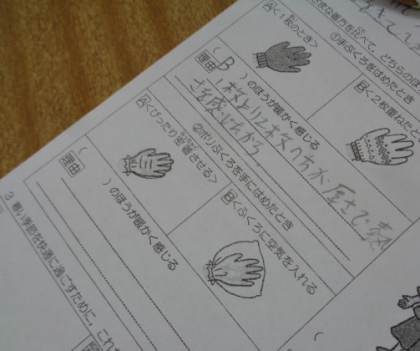 暖かさの感じ方について学習しています。「軍手は2枚重ねの方が暖かかった!」、「ビニル袋に空気がある方が暖かい気がするよ。」と、体験を通し、意欲的に考えていました。学んだことを生活で活かし、暖かく過ごせるといいですね。