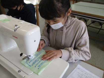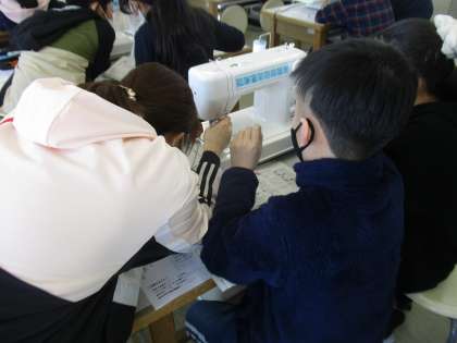 前回の授業で学習したミシンの扱い方を復習し,練習布で実践していきました。