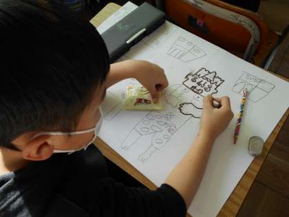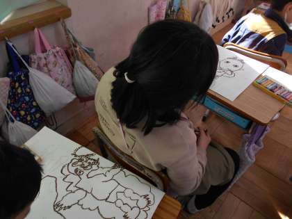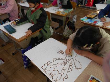 「ないた赤おに」の続きのお話を考え,絵に描きました。今日は,鉛筆で描いた下書きをクレパスでなぞっていきました。