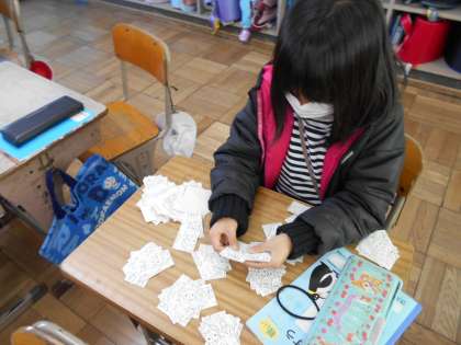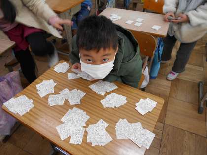 たくさんあるカードの枚数を調べました。「10枚ずつ数えたらいい!」「10のまとまりを10こ集めて100まいにする!」と考えを出し合って,実際に数えてみました。