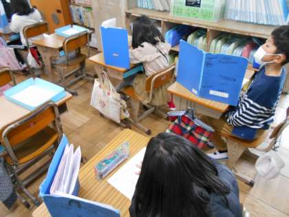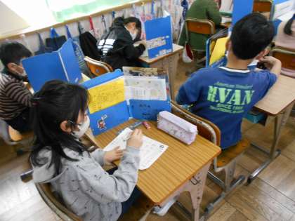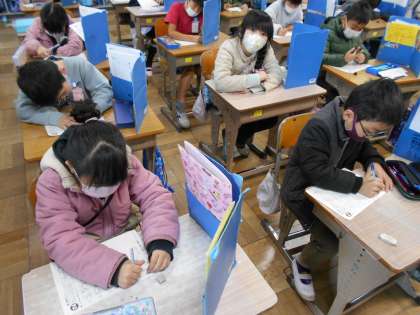 漢字の小テストをしました。とめ・はね・はらいに気をつけて,ていねいな字で書いています。