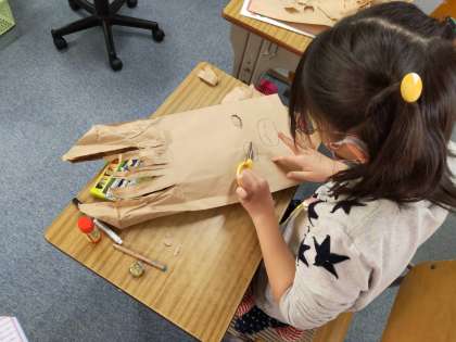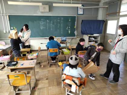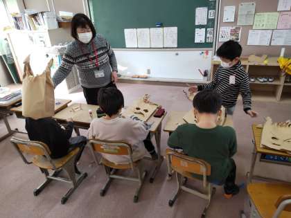 今日のなかよしタイムは,鬼のお面を作りました。明日が節分ということで,紙袋に目と口を出す穴を開けて作りました。
