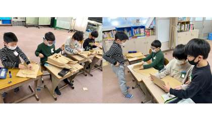 蜜を避けるため,ふだん学習している教室に分かれて,節分の鬼の面を作りました。