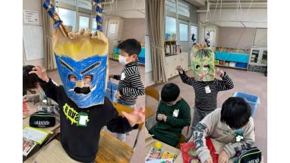 ガゼット袋を切ったり,巻いたり,穴を開けたりして,楽しそうに,角,目,鼻,口,牙,髪の毛などを工夫して作っていました!