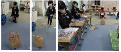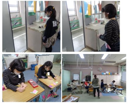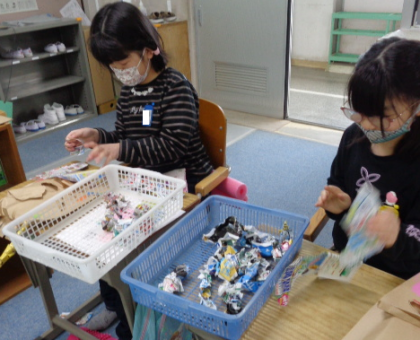 節分の豆まきをしました。チラシで球を作り、紙袋の鬼を倒したり、鬼のかごに何個入るか競ったりしました。廊下に向かって「鬼は外」、教室内に向かって「福は内!」と練習もしました。その後はカード作りです。なかよしお別れ会に向け、1〜5年と6年に分かれて活動を始めました。