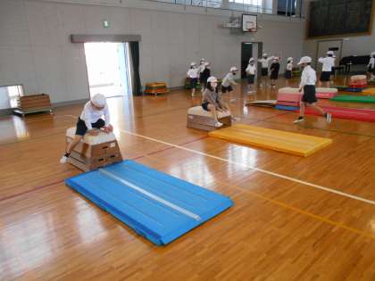 乗馬をするように両手をついて跳び箱に跳び乗りました。