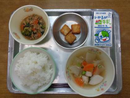 2月10日の給食は「ごはん、牛乳、のっぺい汁、豚肉とかぶのピリ辛煮、厚揚げ田楽」でした。