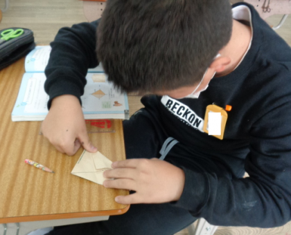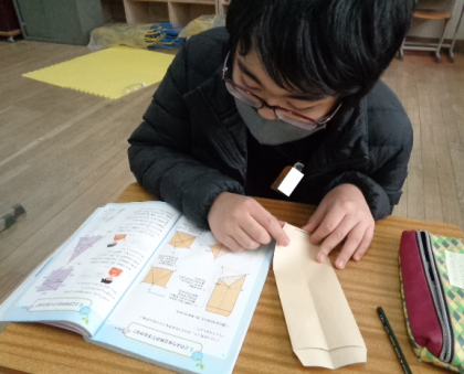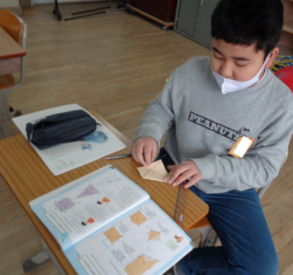 封筒を使って三角柱を作ると、「ピラミッドや!」とはしゃいでいました。どんな展開図になるのかな?開いてみてびっくり!大きな正三角形ができました!