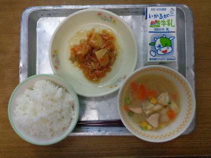 2月17日の給食は「ごはん、牛乳、石狩汁、揚げじゃがのそぼろかけ」でした。