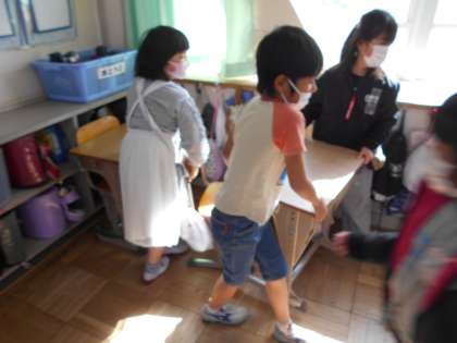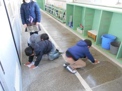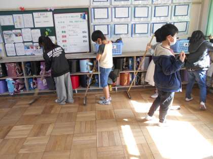 隣のクラスがお休みだったので,隣のクラスの分までいつもより長い廊下を掃除しました。教室では,列になって上手にゴミを集めています。
