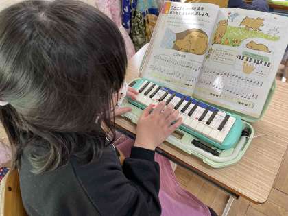 鍵盤ハーモニカをしました。先生の伴奏に合わせて指を動かしました。