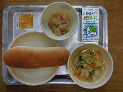 2月21日の給食は「コッペパン、牛乳、みそラーメン、大根のベーコン煮、みかんジャム」でした。