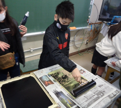 版画をしています。刷ったり、色を塗ったり、完成した人は卒業掲示の製作を協力して分担して作っていたりしました。