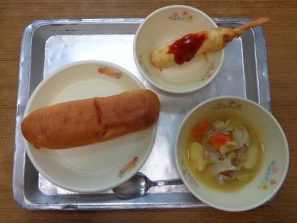3月2日の給食は「ミニミルクパン、牛乳、ポトフ、アメリカンドッグ、トマトケチャップ」でした。