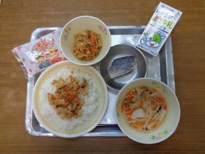 今日の給食はひなまつり献立で、「セルフちらしずし、牛乳、にゅうめん汁、さわらの風味焼、ひなあられ」でした。