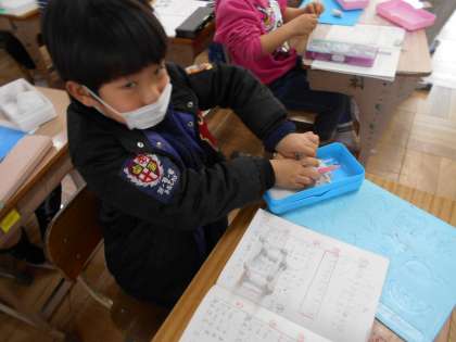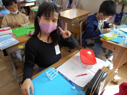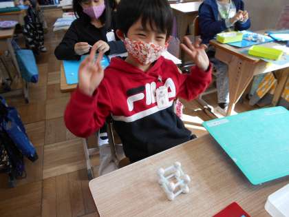 次は,ストローと粘土玉を使って箱の形を作りました。ストローと粘土玉の数から,辺と頂点の数が分かりました。