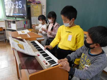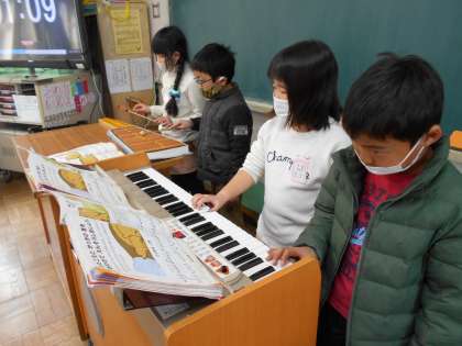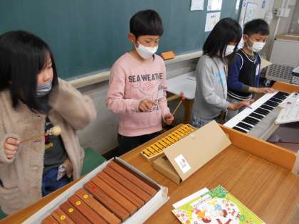 「こぐまの二月」の練習をしています。ピアノ・木琴・鉄琴・低音楽器に分かれて合奏をしました。