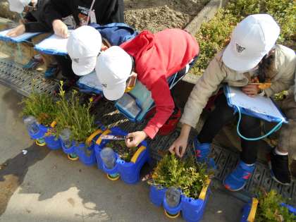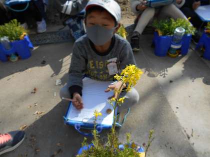 久しぶりに水菜の観察に行きました。何度か収穫したので,葉が固くなり,花が咲いている人もたくさんいました。今までのかんさつ名人を思い出して,じっくり観察することができました。