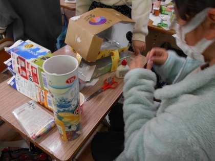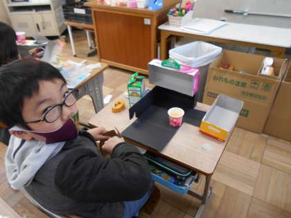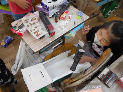 算数で使った箱を再利用して,「ともだちハウス」を作りました。小人の友だちが住んだら楽しい家を想像して作ります。