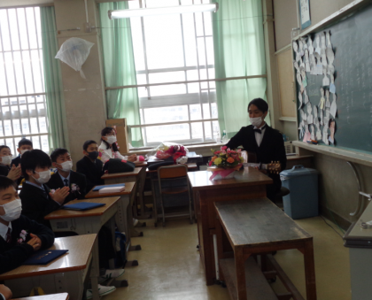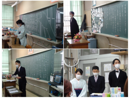 担任によるギターの演奏で盛り上がるクラス、ギャグで笑顔のクラス、一人ずつ教壇に立ちメッセージを伝えるクラス。様々なクラスがありました。黒板には担任の愛情たっぷりのメッセージ!子どもたちはすごく喜んでいました。