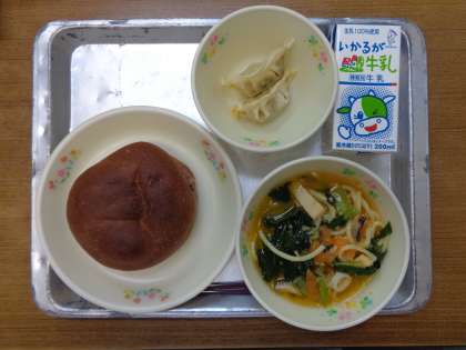 3月23日の給食は「ココアパン、牛乳、小松菜のタンタン麺、焼ギョーザ」でした。