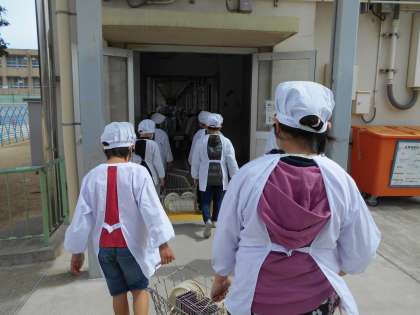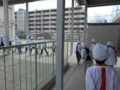 2年生最後の給食でした。静かに食缶を運んでいます。配膳も本当に上手にできるようになりました。3年生でもいっぱい食べて,元気に過ごしてくださいね。