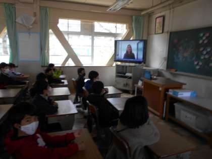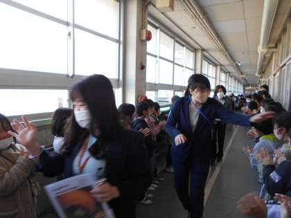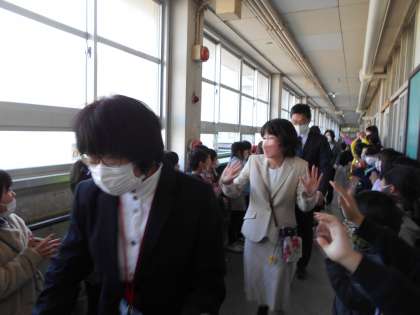 オンラインで修了式・離任式をしました。式のあとは,離任される先生方を見送りました。