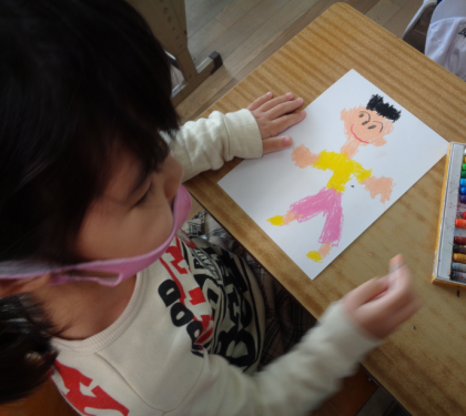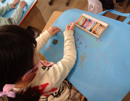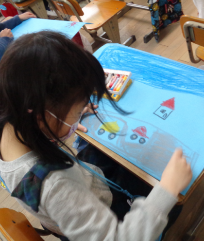 作品バックに好きな絵を描きました。新1年生に向けて、入学祝い用の掲示も作りました。