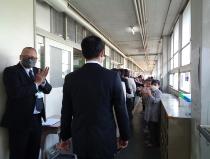 離任される先生方から、全校生徒に向けてお別れの挨拶がありました。各教室で映像を見て、別れを惜しんでいました。教室前を通り、拍手でお見送りしました。