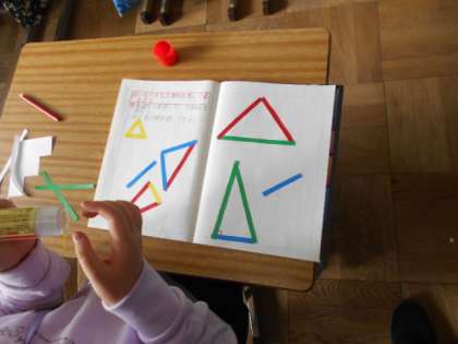 算数では,「三角形と角」の学習に入りました。3本の直線を使っていろいろな三角形を作り,ノートに貼りました。その中から,辺の長さに注目して,二等辺三角形や正三角形の仲間分けをしました。