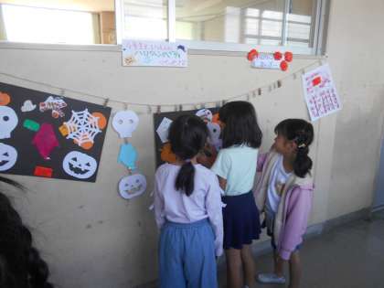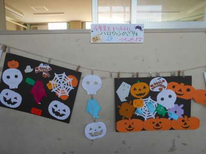 4年生との交流で共同制作した作品です。各なかよし学級前や4年生の教室の前に掲示しています。休み時間には、1年生が見てくれていました。
