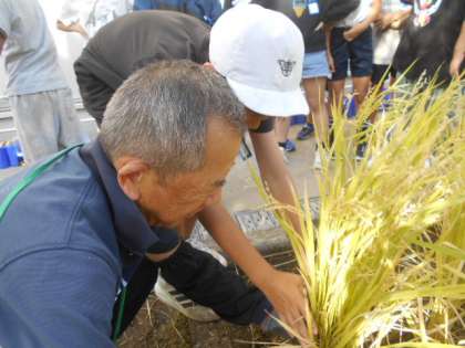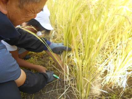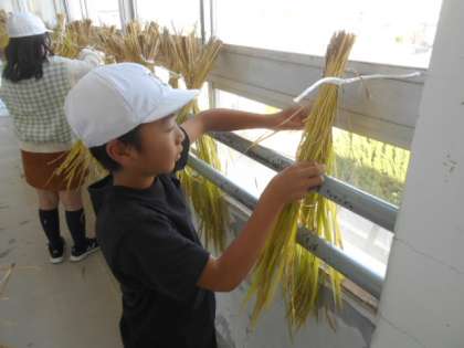 1学期からお米作りをしてきましたが、いよいよ稲刈りの時期になりました。鎌を使って上手に刈り取っていきました。刈り取った稲はひもでしばって、乾燥させています。