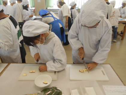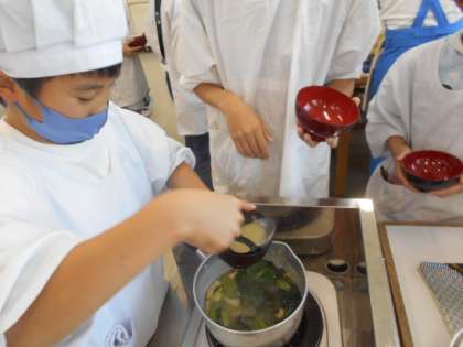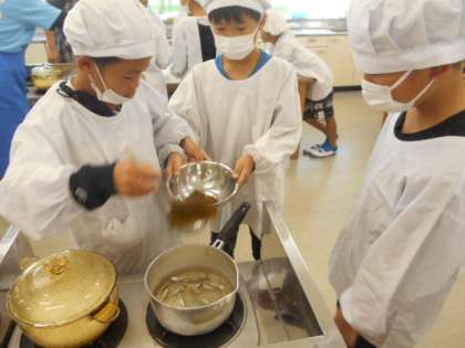 家庭科で料理実習を行いました。お鍋でご飯を炊いて、みそ汁を作り、だしを取った昆布と煮干しで甘辛炒めも作りました。グループで協力して活動できていました。