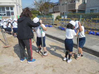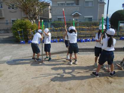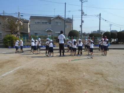 竹馬にチャレンジしました。足の置き方や腕の動かし方などポイントを聞いてペアで取り組みました。