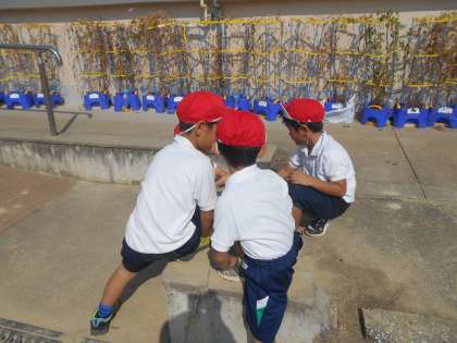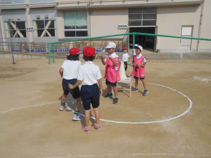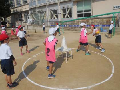 ボールあて運動の試合をしました。途中の作戦会議では、守りをどうしたらいいかを話し合っていました。