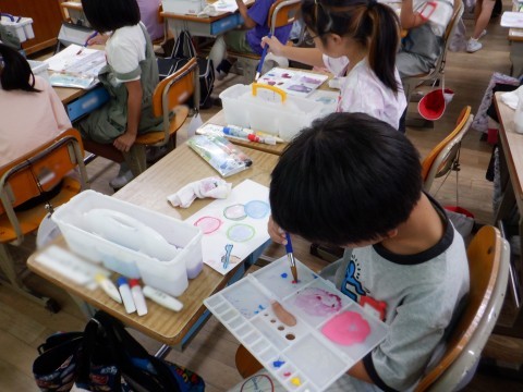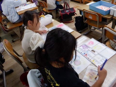 1年3組の図工では、絵の具に水をたっぷり含ませてしゃぼん玉を描いていました。