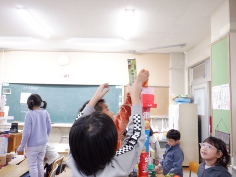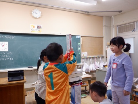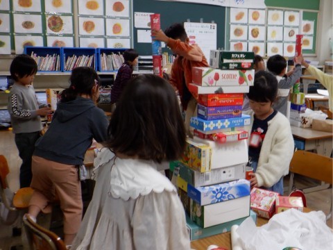 1年1組の算数では、お家から持ってきた様々な形の箱を積み上げて、立体図形に親しんでいました。