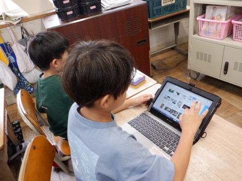 2年2組では、タブレットを用いて、自己紹介の発表ノート作りに取り組んでいました。