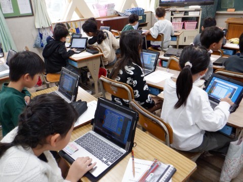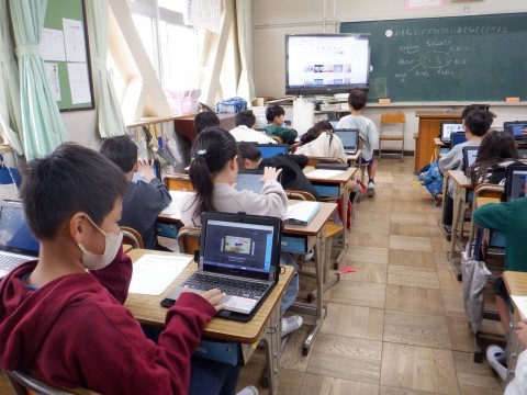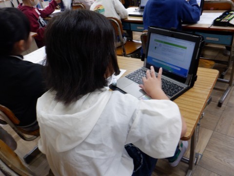 2年2組では、「おもちゃランド」に向けて、作ってみたいおもちゃのことをタブレットで調べていました。